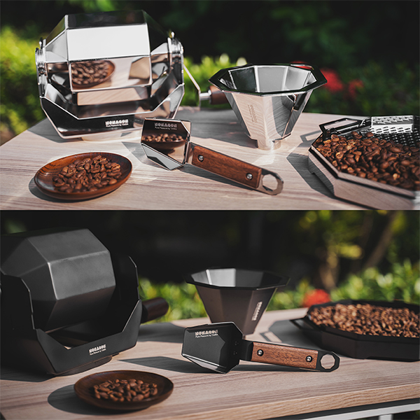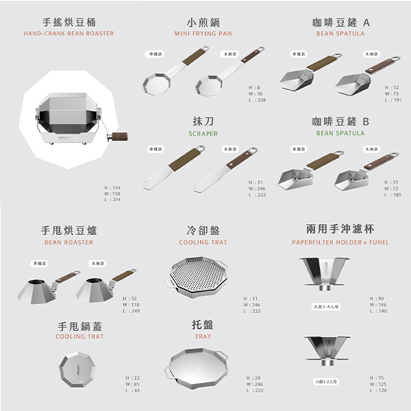 NONAGON 系列-烘豆工具 應用範圍:小巧輕便容易攜帶,讓每位咖啡愛好者,都能輕鬆掌控烘豆樂趣! 產品規格:手搖烘豆桶/手甩烘豆爐/小煎鍋/咖啡豆鏟/濾杯/冷卻盤 顏色:不鏽鋼原色/鍍鈦黑 使用板材:不鏽鋼、不鏽鋼+鍍鈦黑 詢價